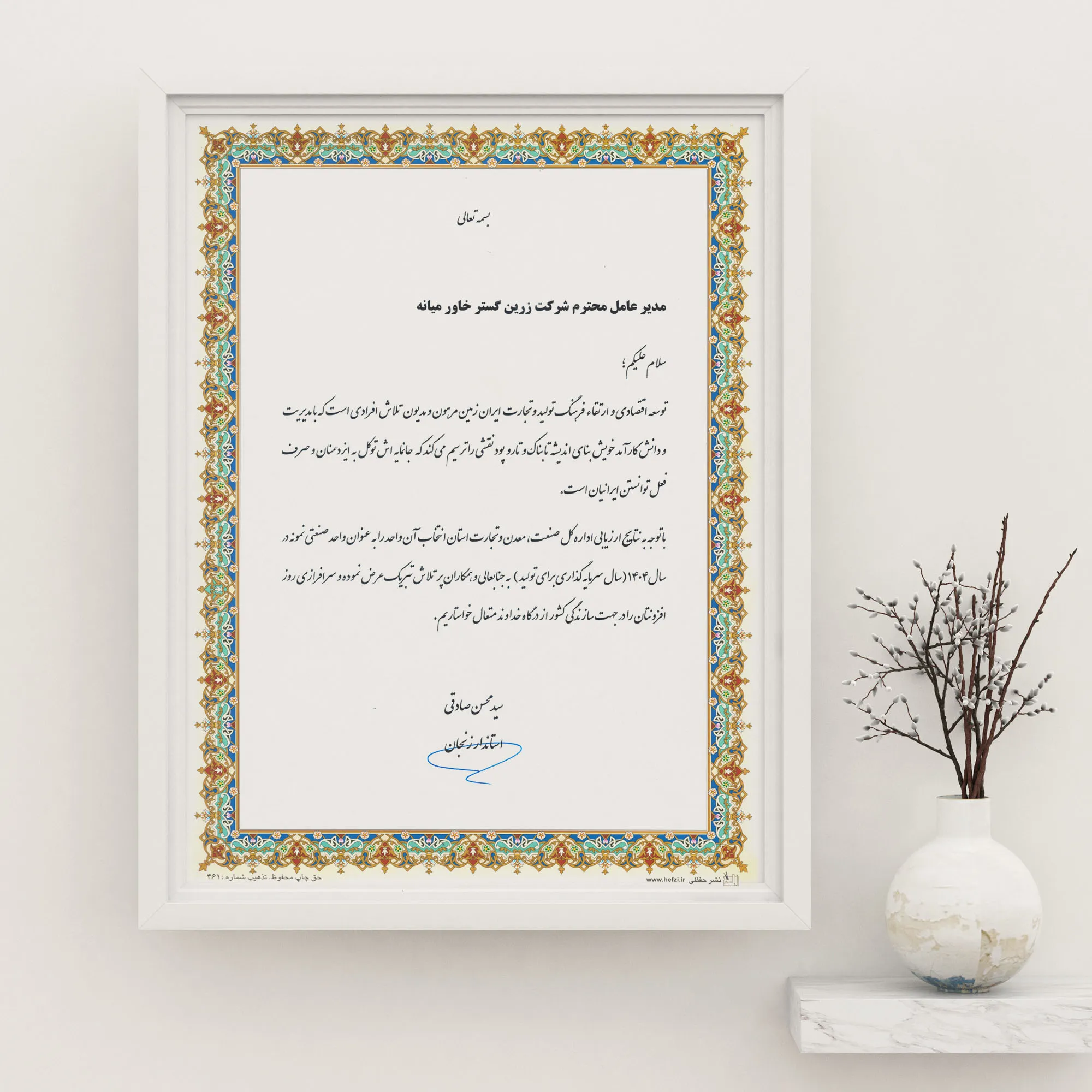 در متن این تقدیرنامه که به امضای آقای سید محسن صادقی، استاندار مرکزی رسیده است، از تلاشهای مستمر مدیرعامل، کارکنان و مجموعه شرکت در مسیر توسعه اقتصادی و ارتقای تولیدات داخلی تقدیر بهعمل آمده است.